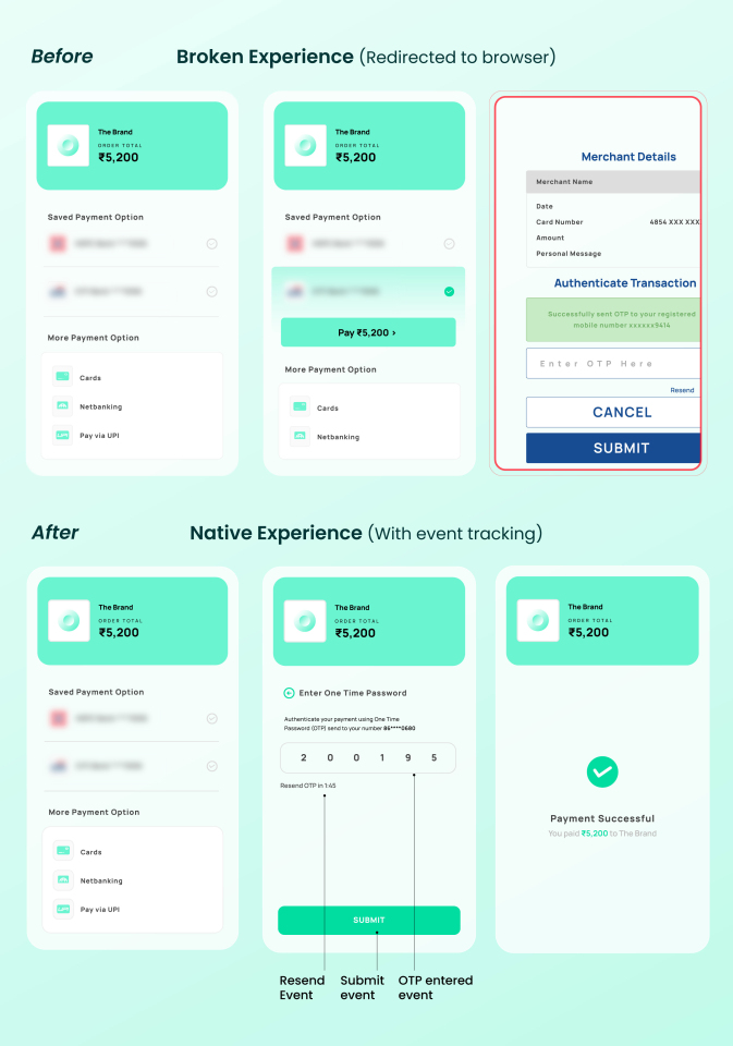 • Disrupted User Experience – Switching from a merchant’s sleek interface to various bank OTP pages creates a disjointed experience.